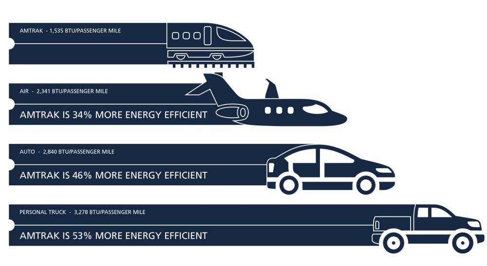 Traveling on Amtrak is 46 percent more energy efficient than traveling by car and 34 percent more energy efficient than domestic air travel on a per-passenger-mile basis.